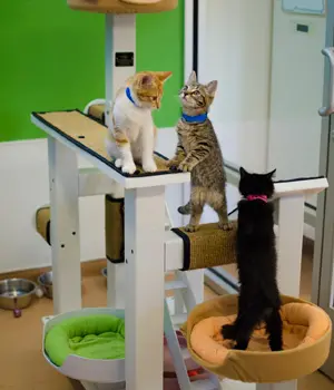 Perches and resting places – some with hiding opportunities – should outnumber the cats in the room. Remember, each cat needs control over his or her environment by having a choice of options. Hiding and perches/resting places should be spread throughout the room so cats need not cross the path of other cats to get to one.