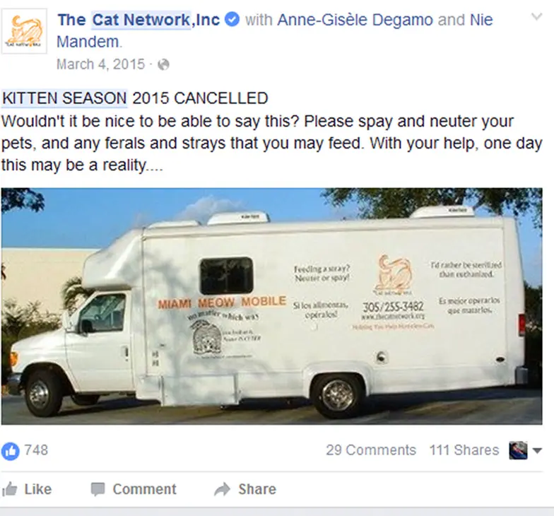 The Cat Network, Inc had the idea to psych out their Facebook fans by declaring that kitten season was cancelled—and then included a call to action to help make this dream a reality. This tactic proved to be a smart way to spread the word, with the post securing many likes and shares.