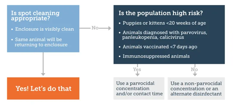 Spot cleaning is recommended when an animal's enclosure isn't visibly dirty and the same animal will continue to be housed in the enclosure. This reduces animal stress and handling, conserves cleaning supplies and boosts efficiency. Focus on areas that need attention, and save time on non-contaminated surfaces.