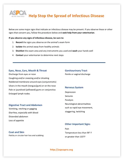 This poster, with photo examples, demonstrates the various signs of infectious diseases that shelter staff may encounter in their daily work. Display it wherever you house animals or anywhere infectious disease may be present.
